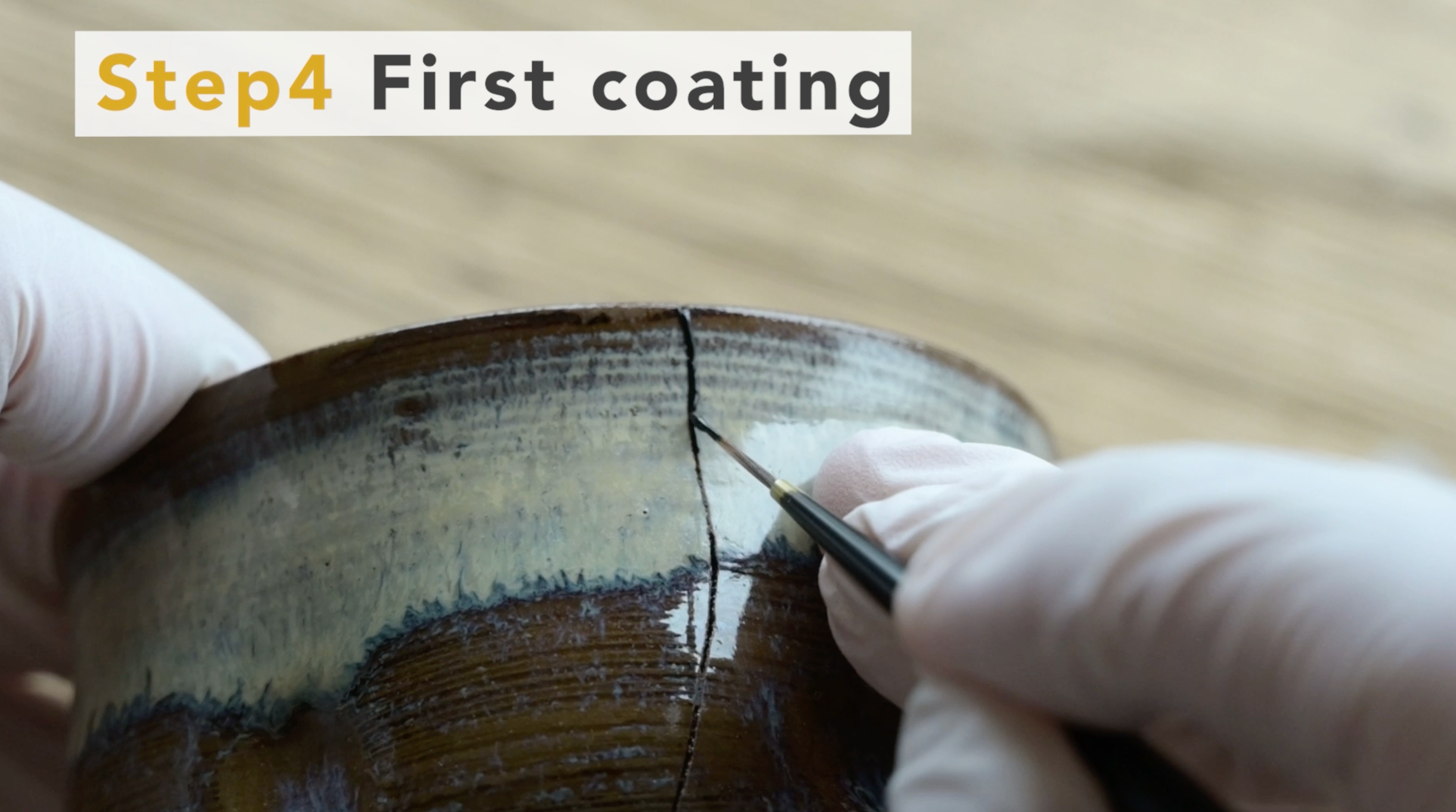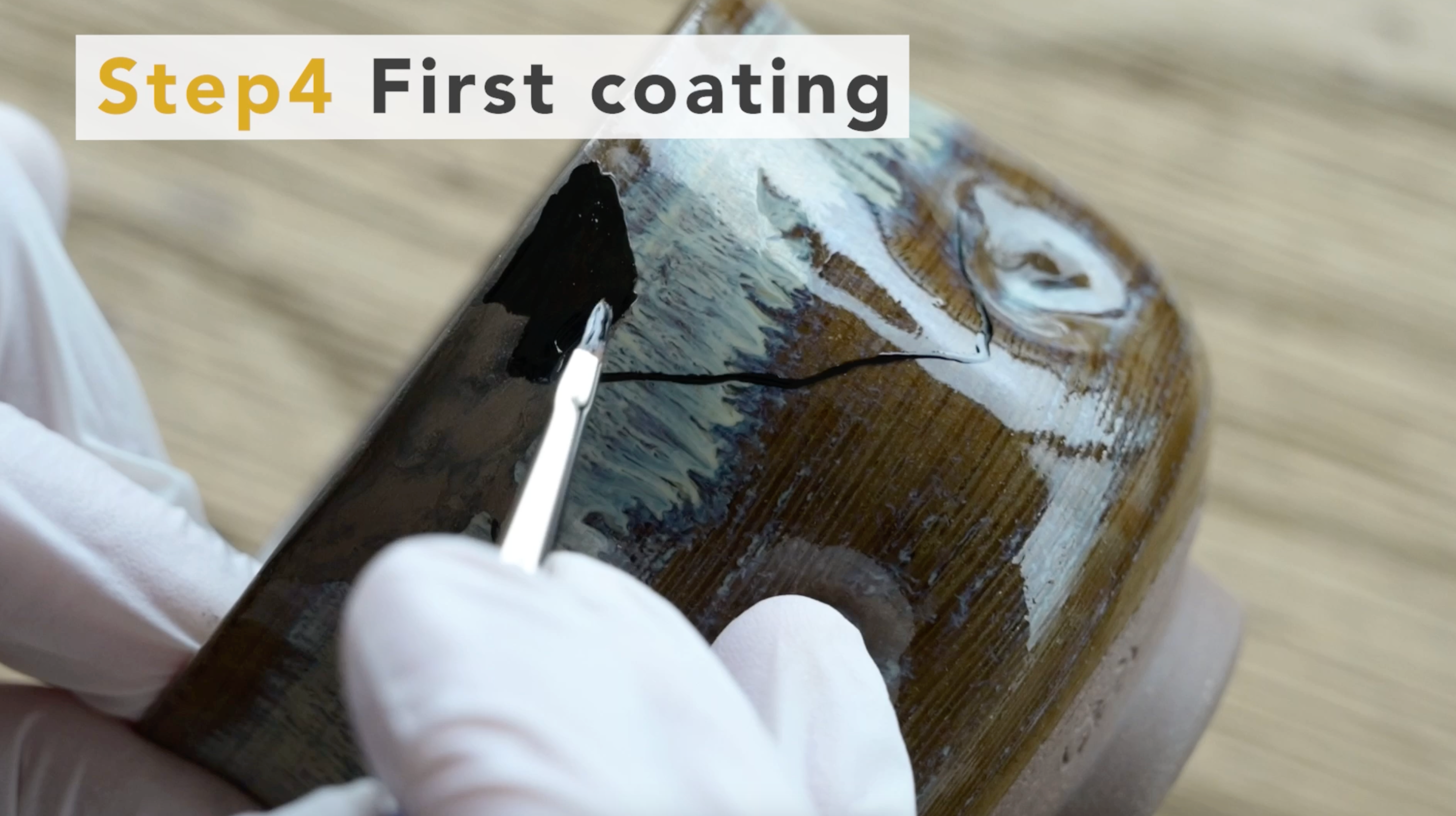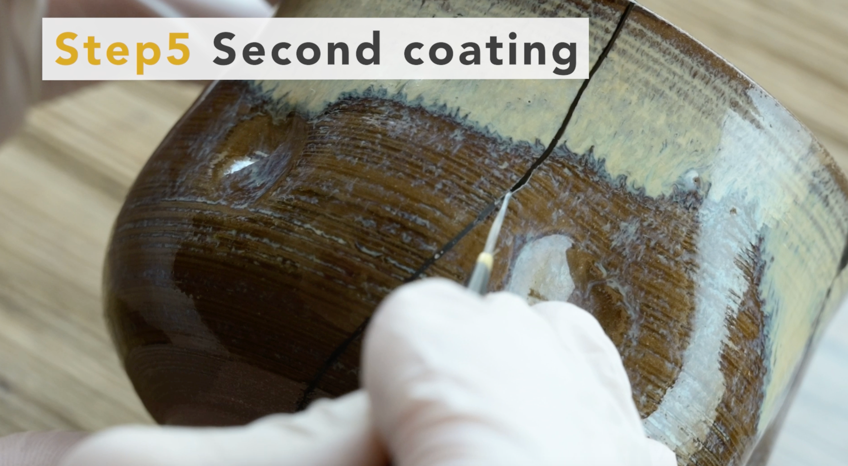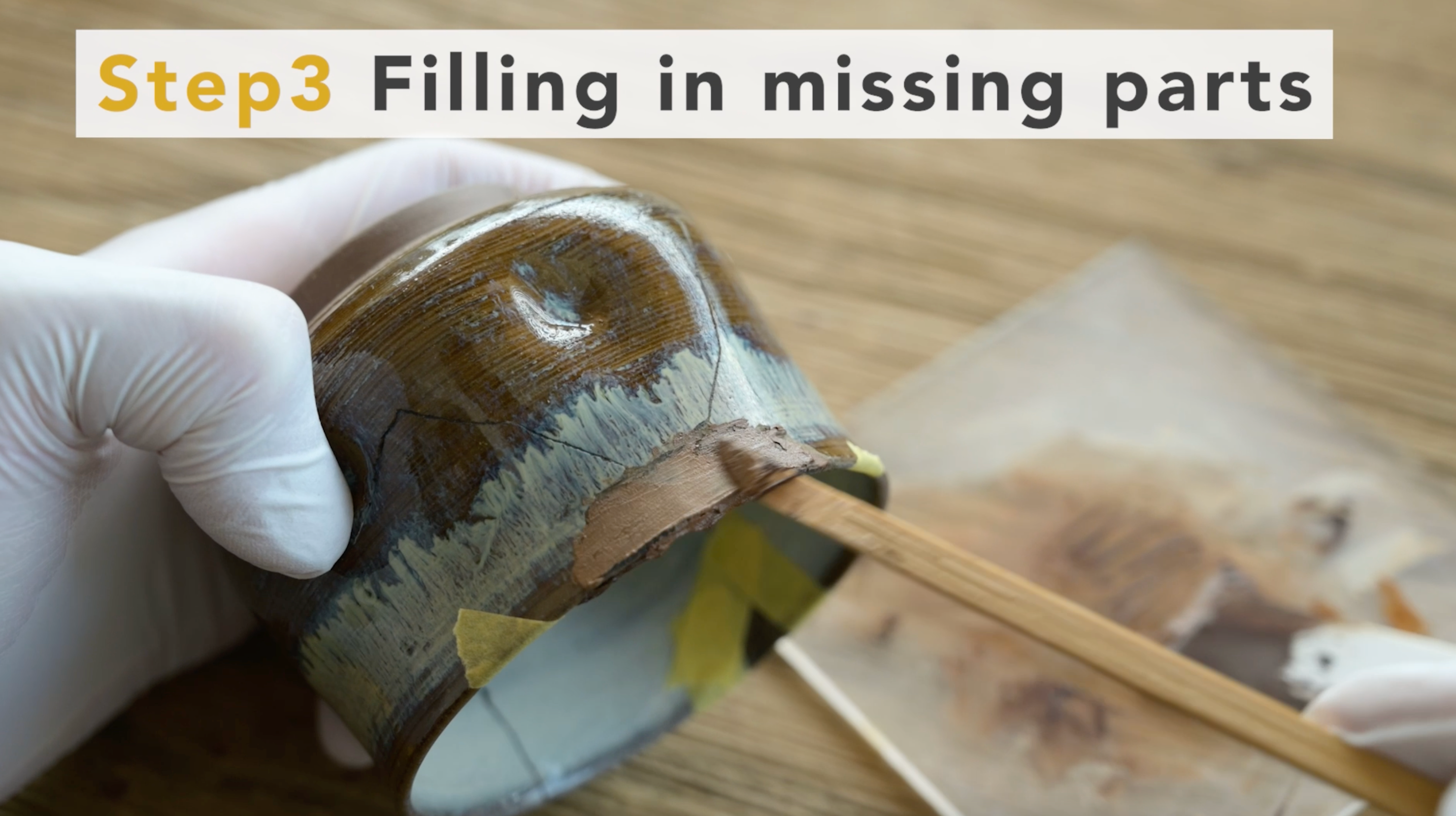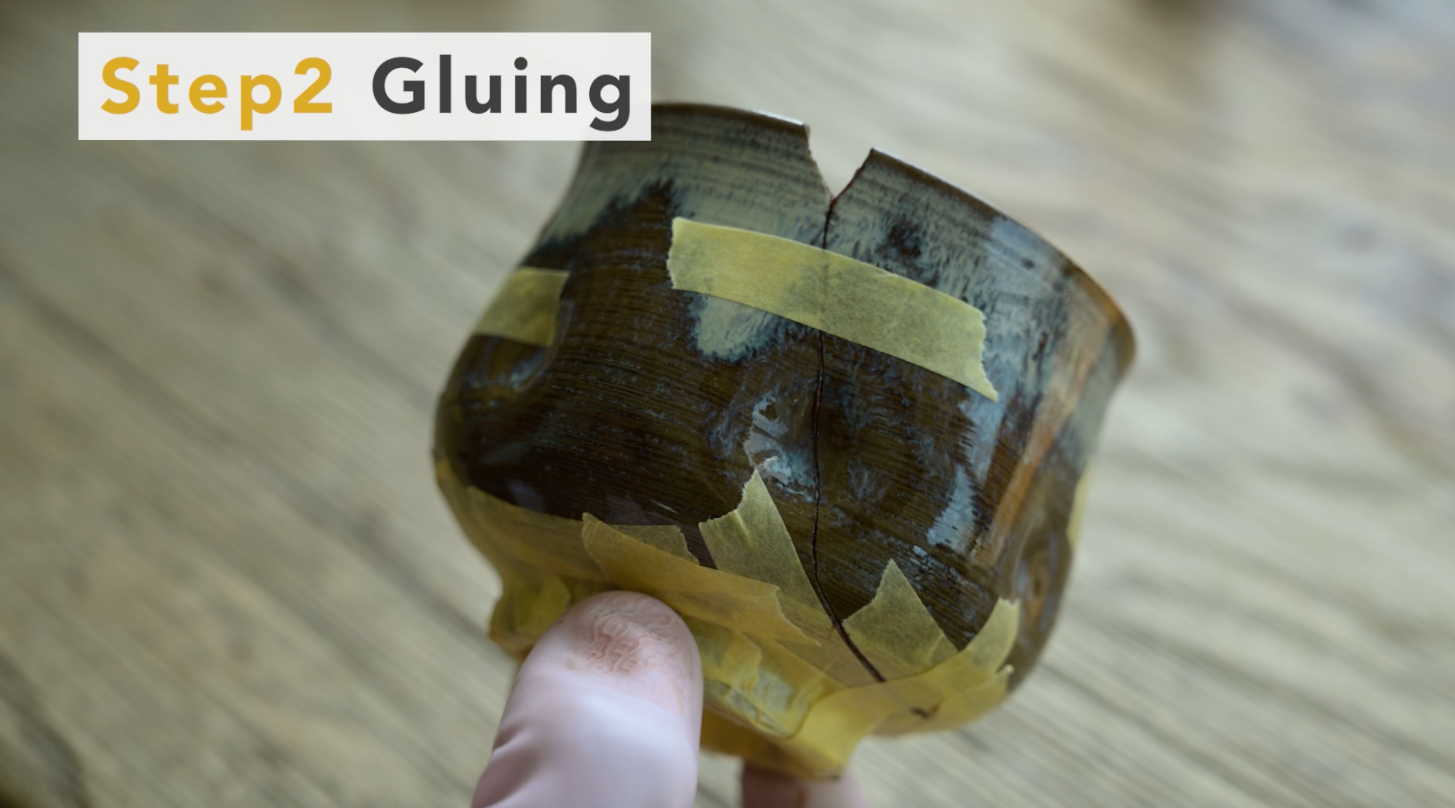 *For ceramics with thin glaze or those which urushi is likely to bleed through, use masking tape to protect the area around the joints in advance.