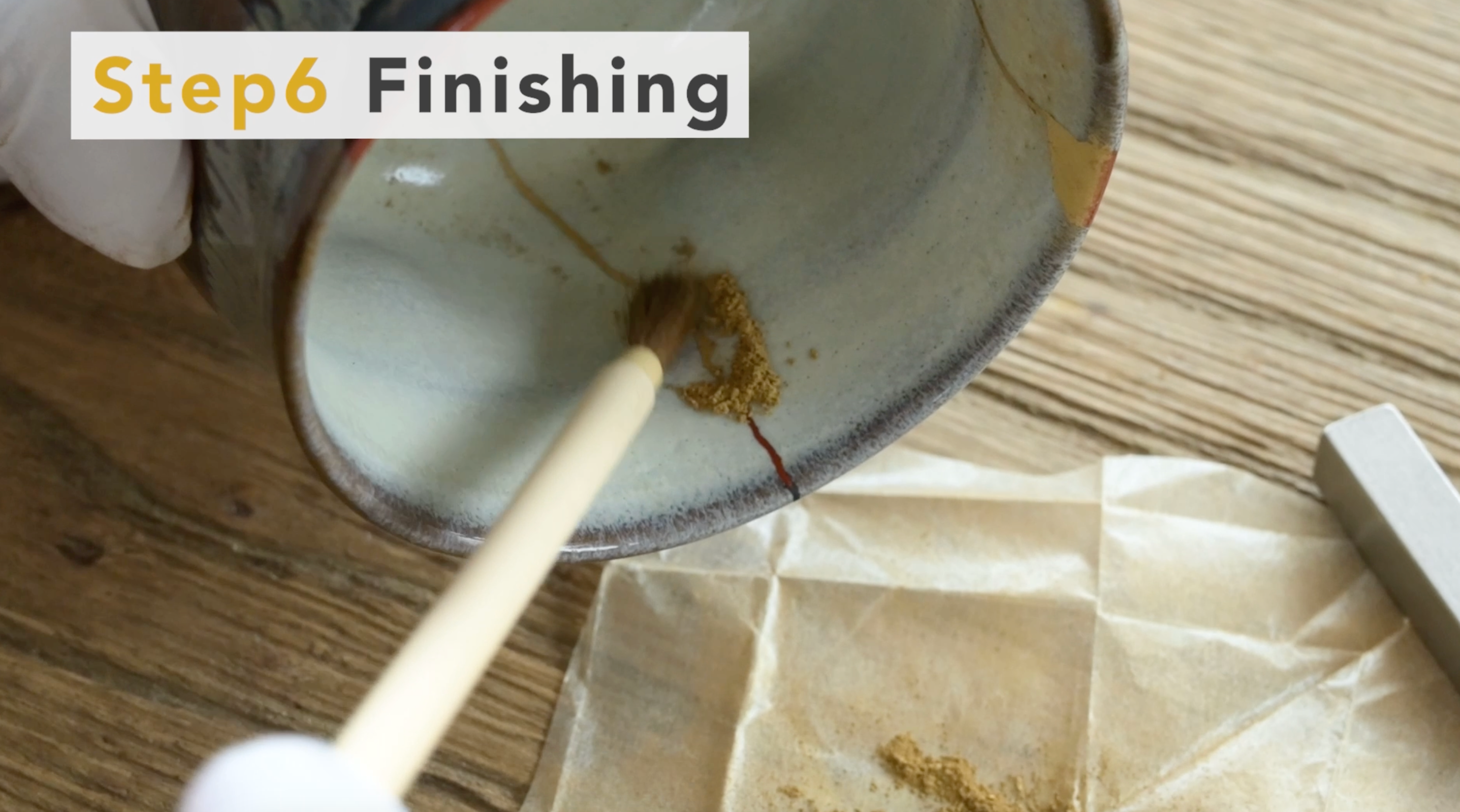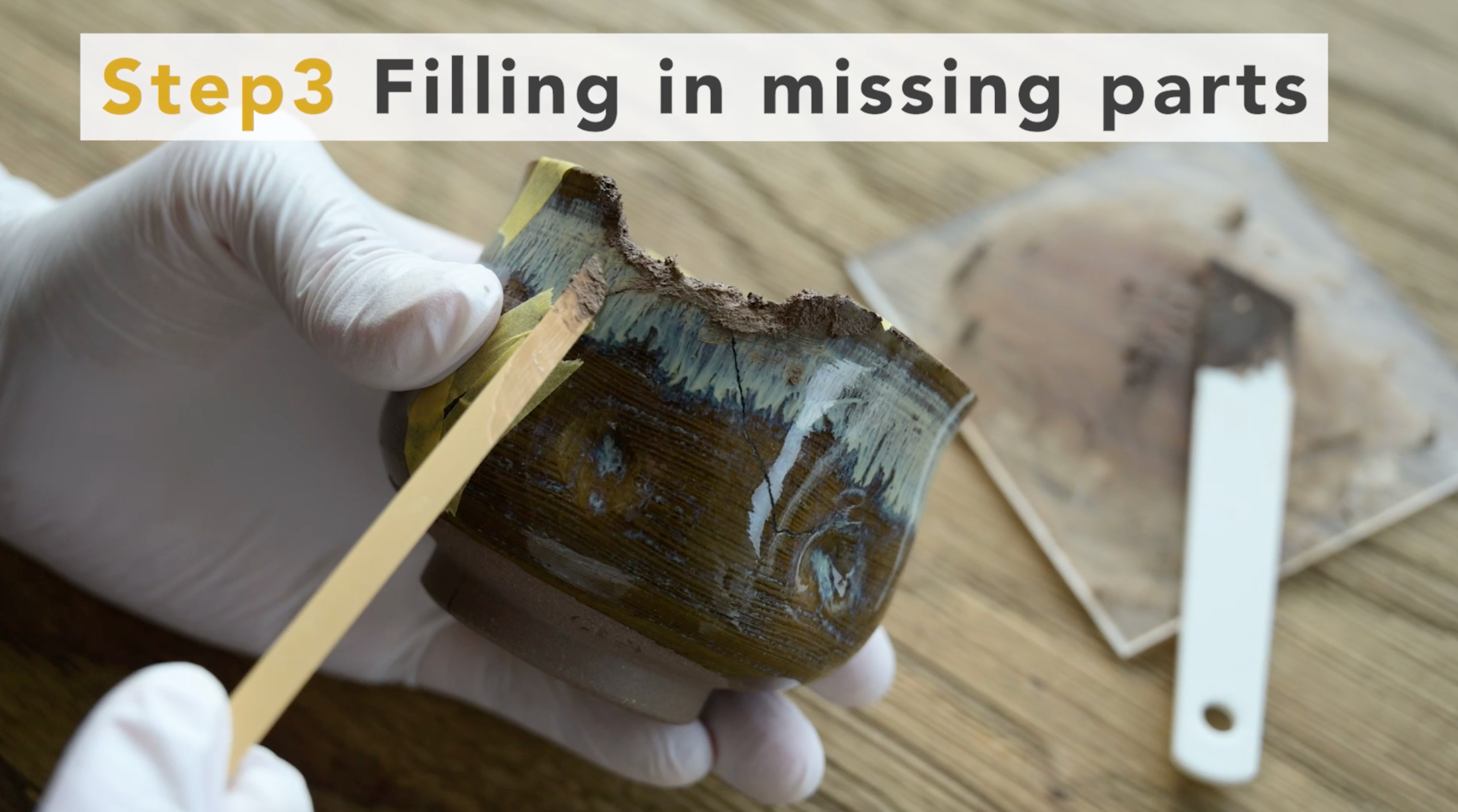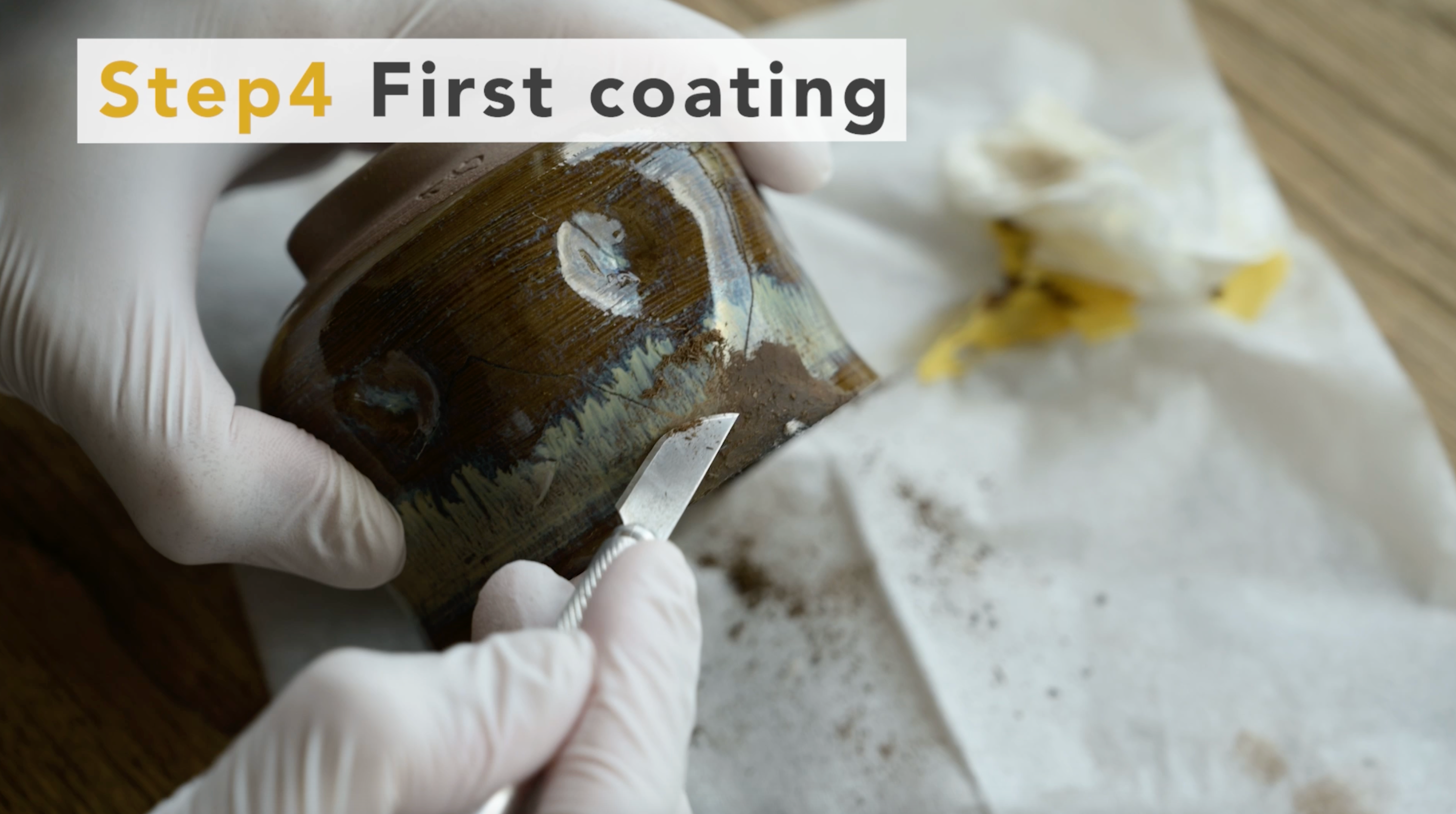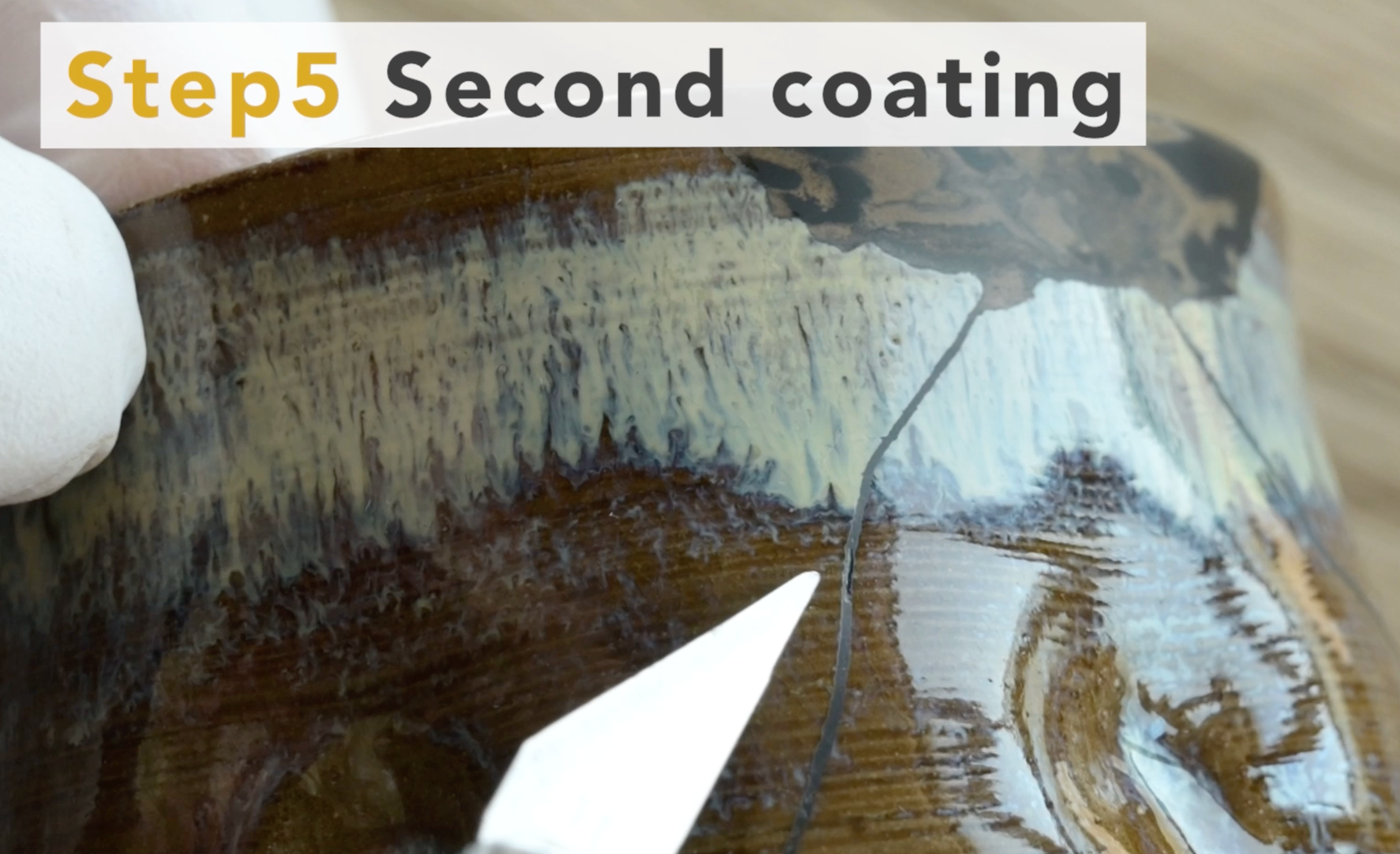 *For ceramics with thin glaze or those which urushi is likely to bleed through, use masking tape to protect the area around the joints in advance.