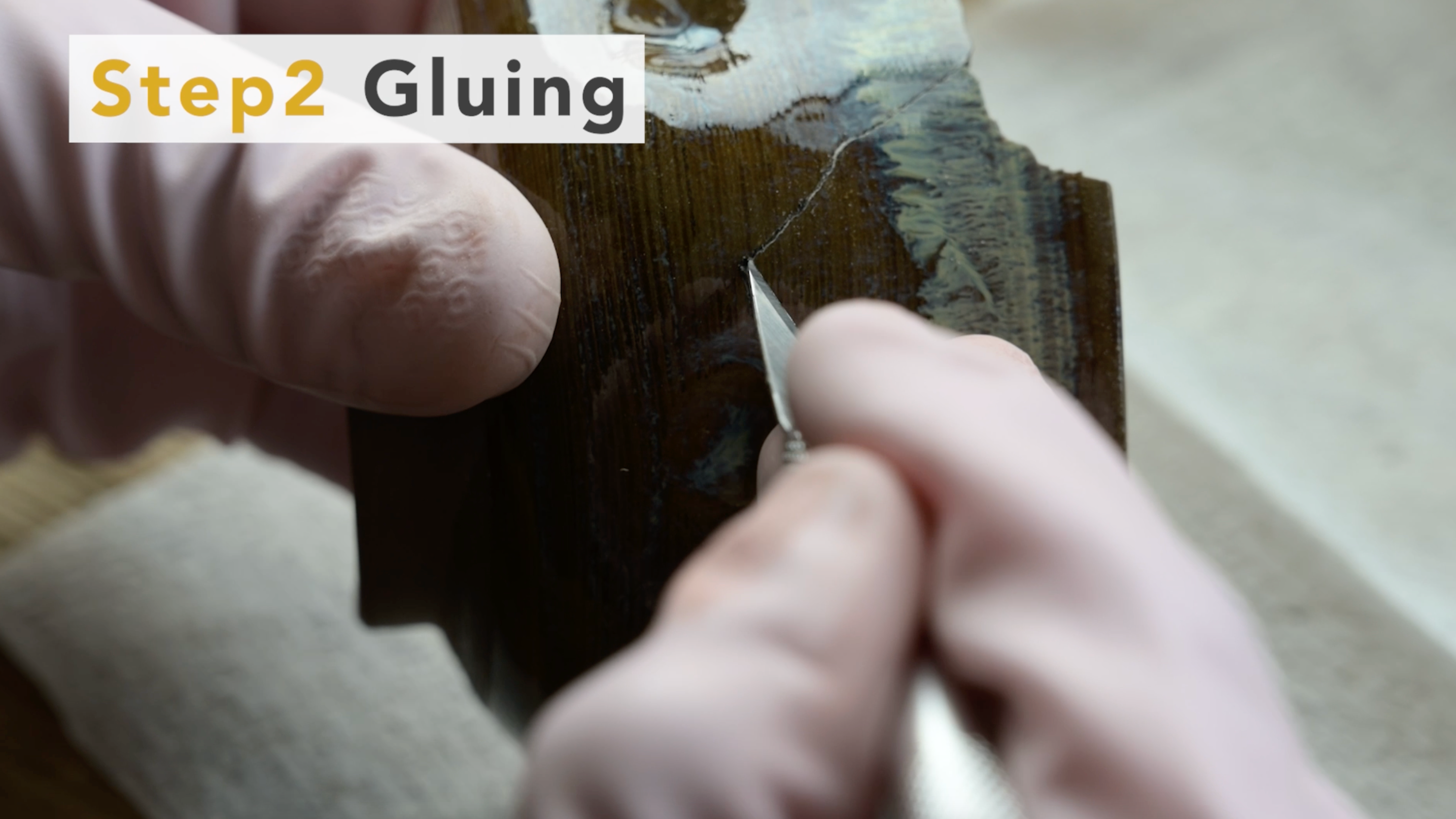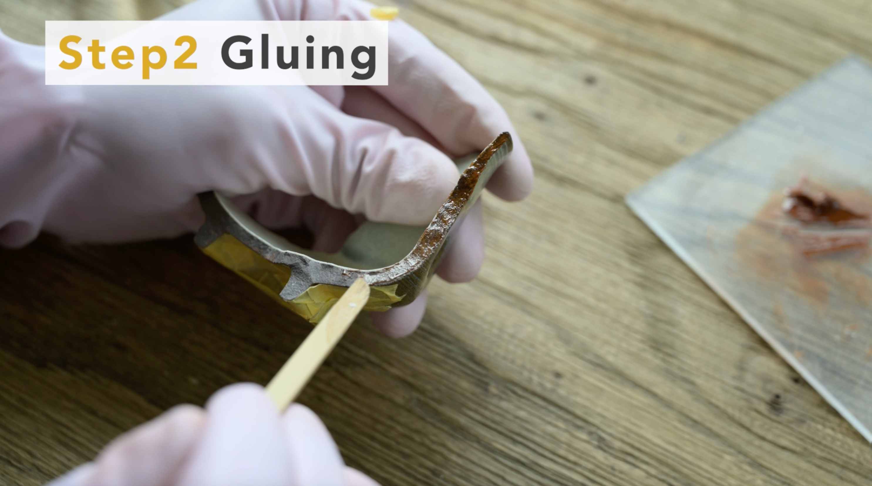 Apply a thin layer of mugi-urushi to the cross section of the fragments.