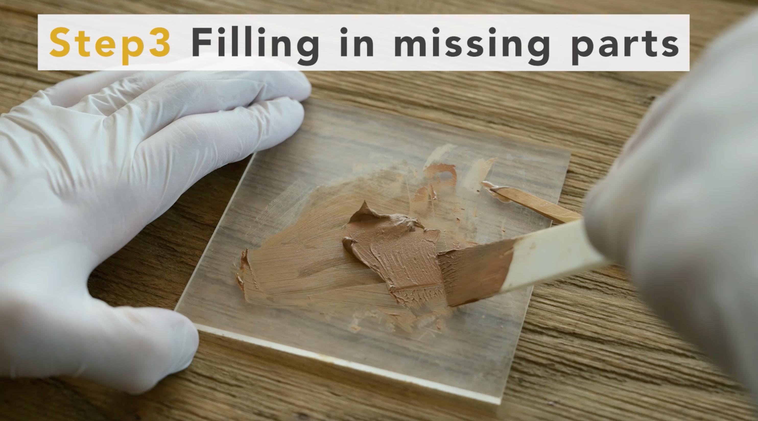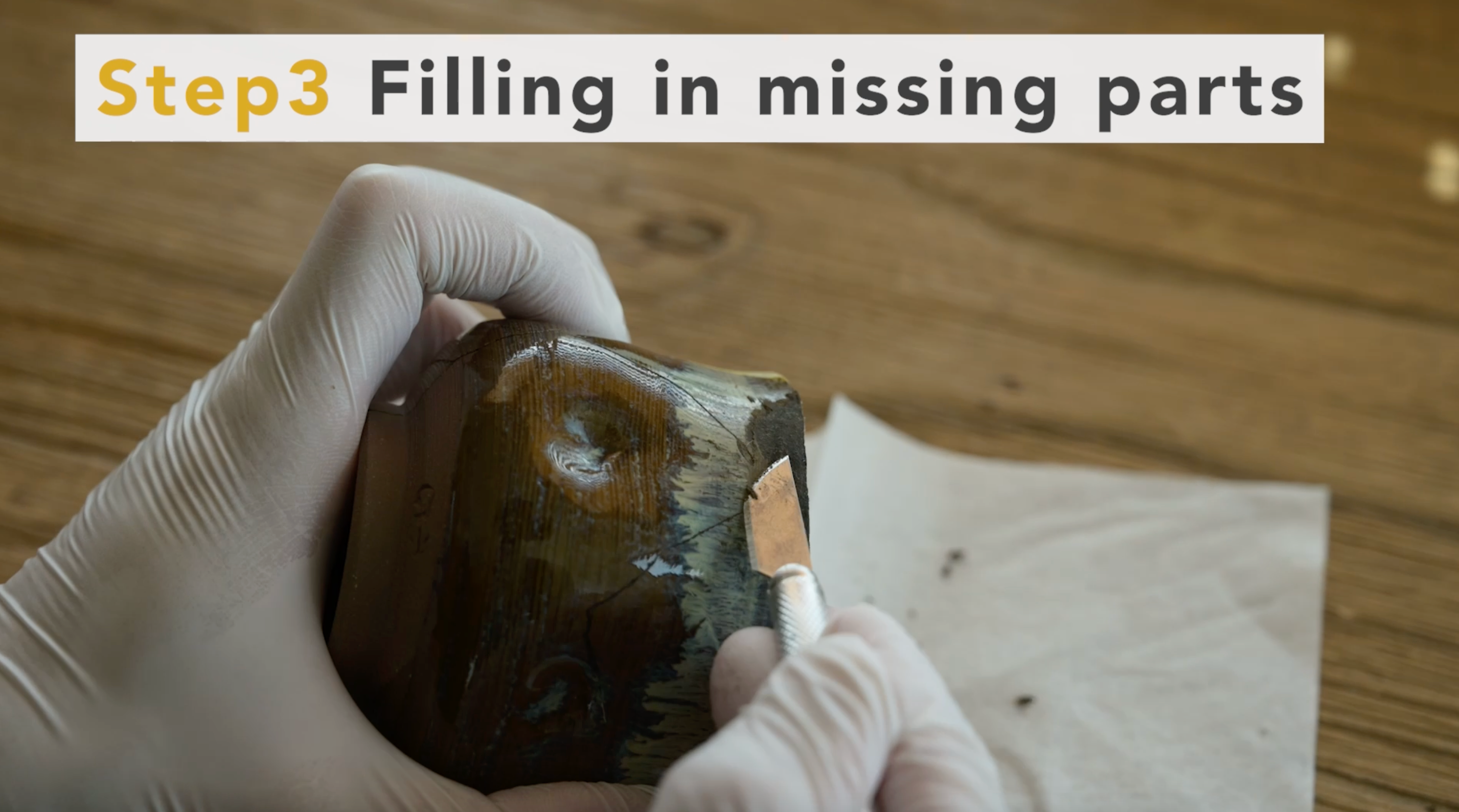 Once excess mugi-urushi is removed, we will use "Kokuso-urushi" to fill the missing area.