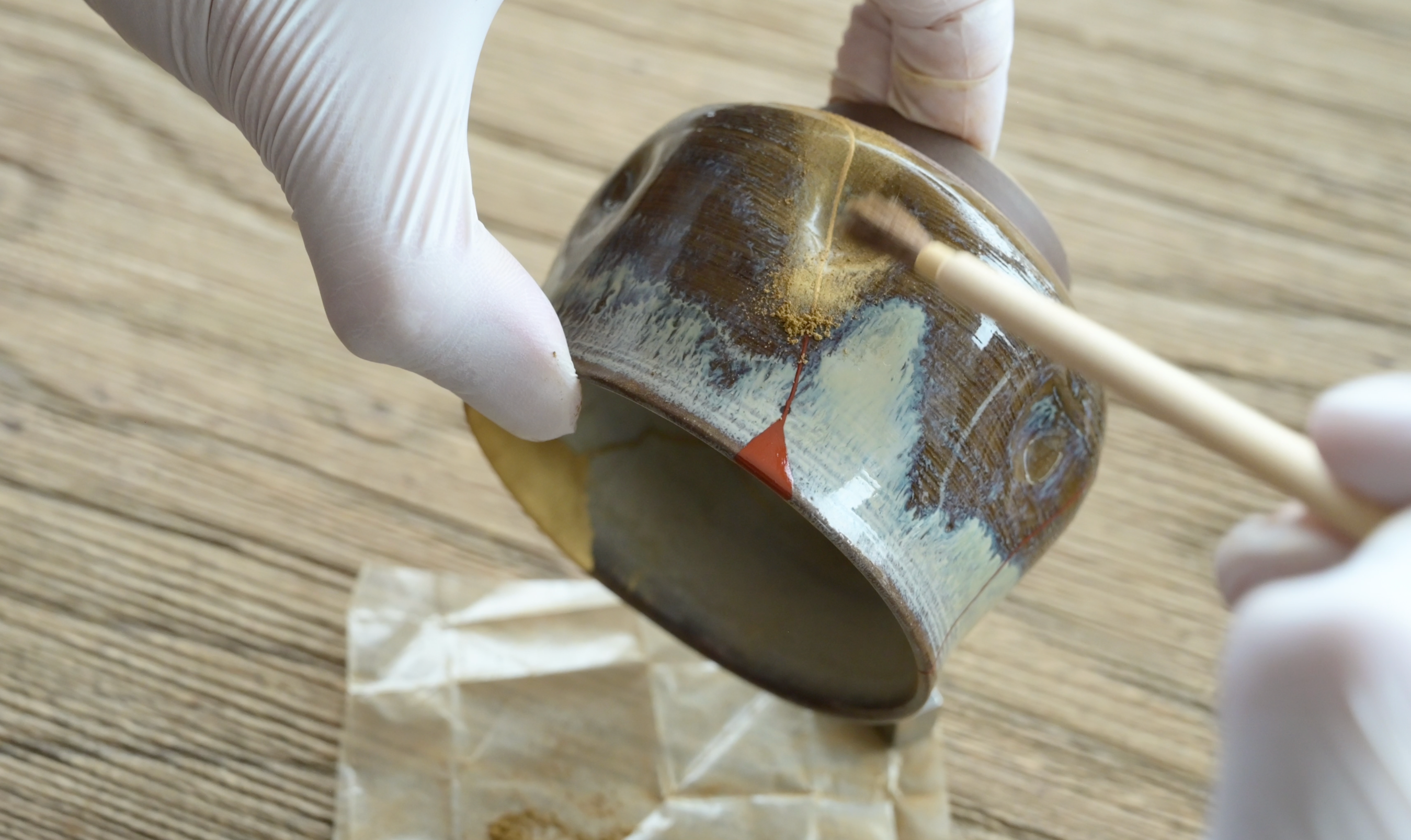 Then, before the bengara urushi dries, gold powder is applied on top of it.
